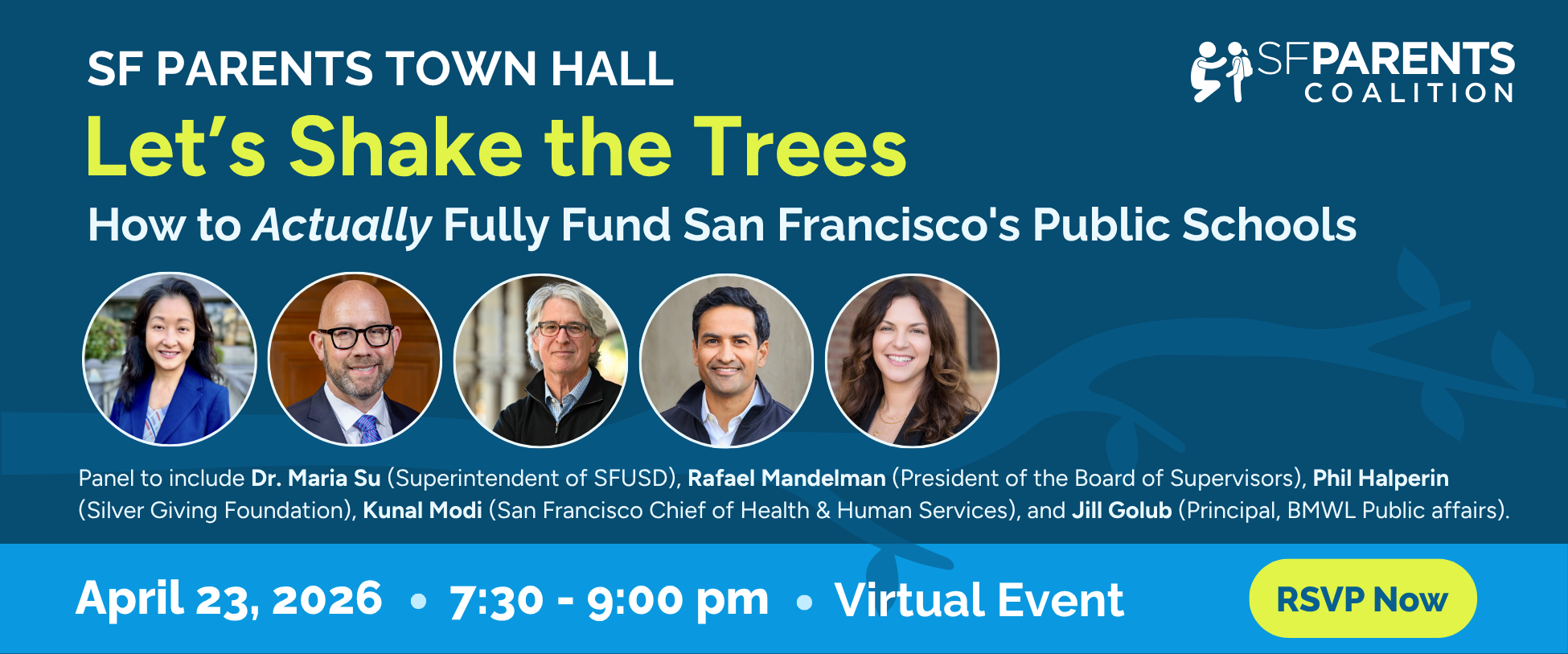 It’s no secret that the district’s finances are still in trouble, and schools are seeing that with the budgets proposed for 26-27 school year. We’ve been strong, proud advocates for the past five years for the district to operate a balanced budget—rather than grow its structural deficit—tying dollars and resources closest to where they matter most: to support teachers and instruction and to improve student outcomes. Join SF Parents on April 23 for a virtual town hall bringing together key leaders, including Superintendent Maria Su, Board of Supervisors President Rafael Mandelman, Mayor’s Office Chief Kunal Modi, Phil Halperin of Silver Giving, and Jill Golub of BMWL Public Affairs to get real with the SFUSD community on the status of our overall local and state school fundingand opportunities to mobilize together and go after more of it!